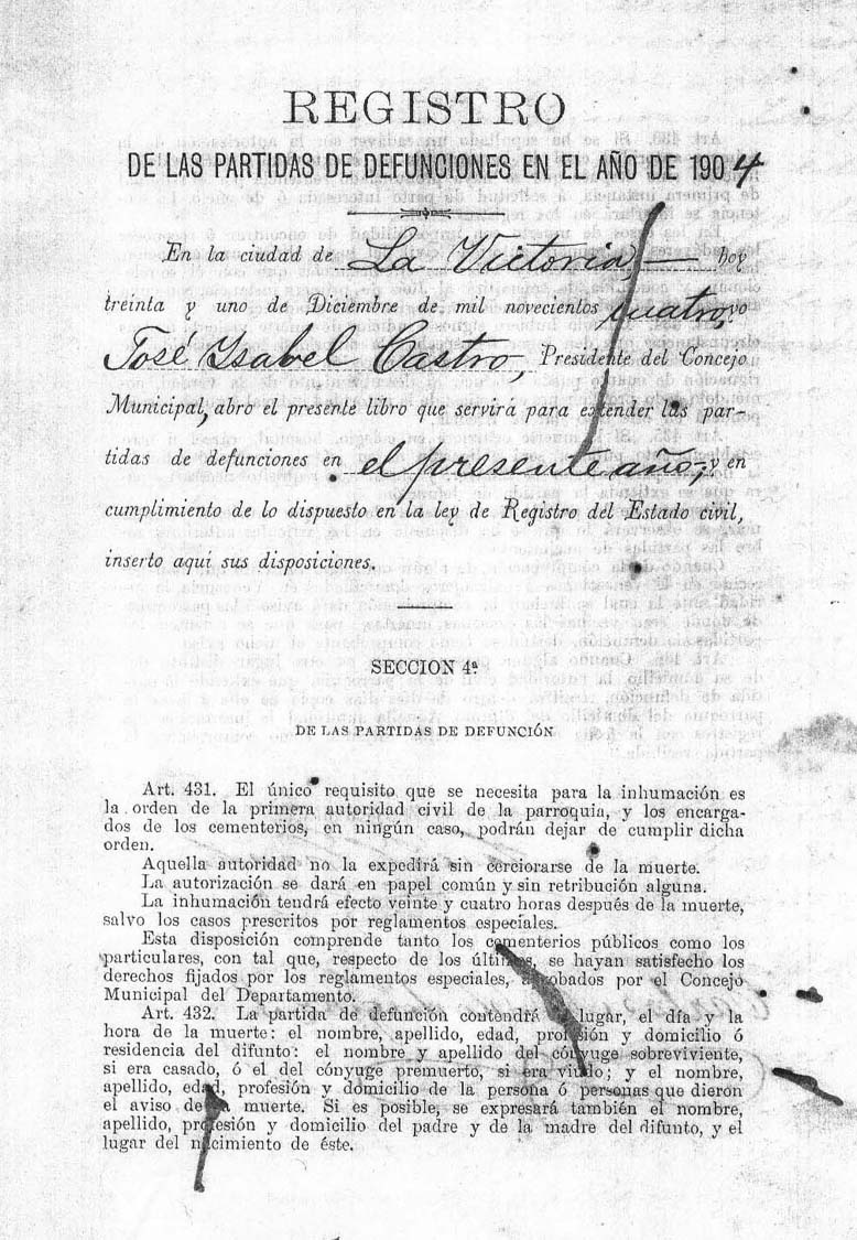 Apertura del primer libro de registro de partidas de defunción del Municipio Castro en 1904. Hoy, Municipio Santos Michelena. Regresar a Documentos