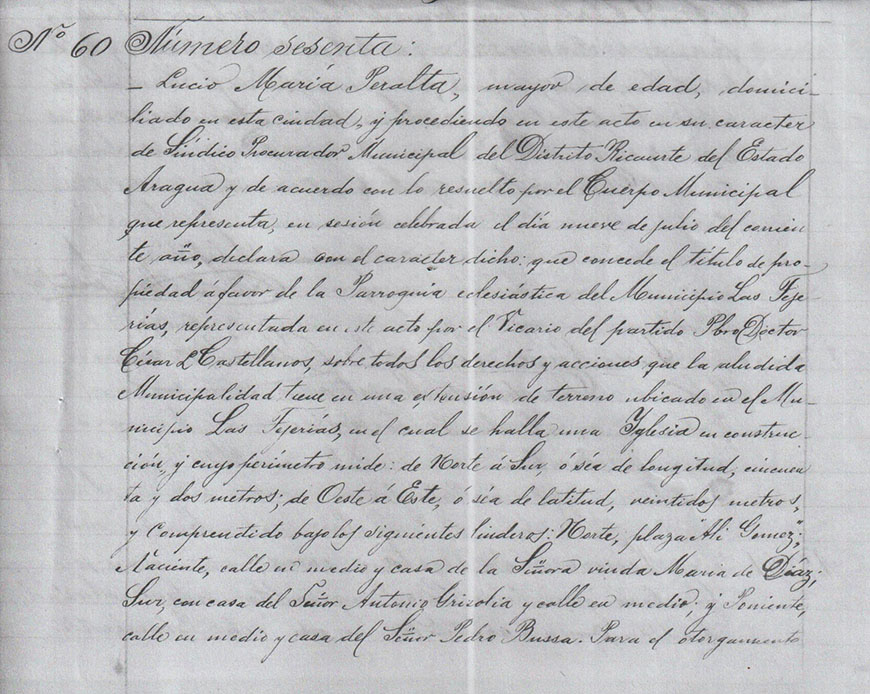 Lucio maría Peralta, mayor de edad, domiciliado en esta ciudad y procediendo en este acto en su carácter de síndico procurador municipal del Distrito Ricaurte del estado Aragua, de acuerdo por lo resuelto por el cuerpo municipal que representa, en sesión del día de hoy nueve de julio del corriente año declara con el carácter que concede el título de propiedad en favor de la parroquia eclesiástica del municipio Las Tejerías representada en este acto por el vicario del parido Pbro. Doctor César Castellanos sobre todos los derechos y acciones que la eludida municipalidad tiene en una extensión de terreno ubicado en el municipio Las Tejerías en el cual se encuentra una iglesia en construcción y cuyo perímetro mide de norte a sur a sea su longitud cincuenta y dos metros y de oeste a este o sea de latitud veintidós metros y comprendido entre los siguientes linderos. Norte Plaza Ali Gómez, Naciente, calle en medio, casa de la señora viuda Mara de Diaz, Sur casa del señor Antonio Grisolía y calle en medio y Poniente casa del señor Pedro Bussa. Para el otorgamiento de este título está en todo de acuerdo la junta Comunal del predicho Municipio Las Tejerías según un acto de fecha veinte y uno de Julio del año en curso, yue corre inserta en el libro respectivo. El Presbítero Dr. César Castellanos en el carácter que se expresa en este instrumento compromete u obliga a la parroquia eclesiástica de las Tejerías a gestionar y llevar a efecto cuanto antes le sea posible la terminación de la eludida Iglesia hoy en construcción y acepta en todo el contenido de esta escritura. Apreciamos para los efectos del registro de este documento la cantidad de quinientos Bolívares ( Bs. 500 ). Así lo decimos otorgamos y firmamos a los once días del mes de Agosto de mil novecientos veinte cuatro. Lucio M. Peralta, Pbro. Dr. Cesar L Castellanos