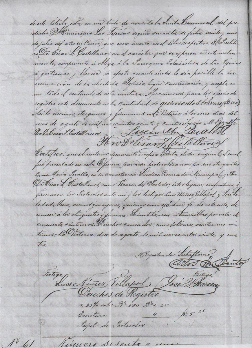 Certifico que el anterior documento es copia fiel y exacta del original el cual fue presentado en esta oficina para su protocolización por sus otorgantes Lucio María Peralta en su carácter de sindico procurador Municipal y l Pbro. Dr. César L. Castellanos como vicario del partido; estos leyeron confrontaron y firmaron los protocolos ante mi y los testigos Luis Nuñes Villapol y José soledad Mena vecinos y mayores, quienes como yo dan fe de este acto de conocer a los otorgantes y firman. Se inutilizan estampillas por valor de cincuenta céntimos. Derechos causados. Cinco Bolívares, venticinco céntimos. La victoria doce de Agosto de mil novecientos venticuatro.