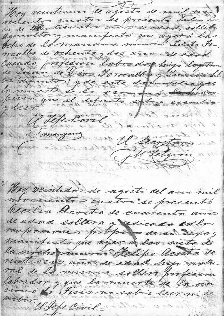 Primera partida de defunción del Municipio Castro, 1904.Hoy, Municipio Santos Michelena. Regresar a Documentos