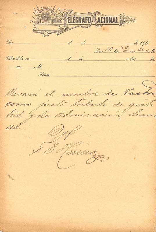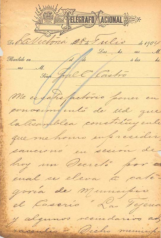 Telegrama de la Asamblea Constituyente, fechado el 28 de julio de 1904, mediante el cual se informa al presidente de la República de Venezuela, Cipriano Castro, sobre la elevación de Las Tejerías a Municipio Castro.